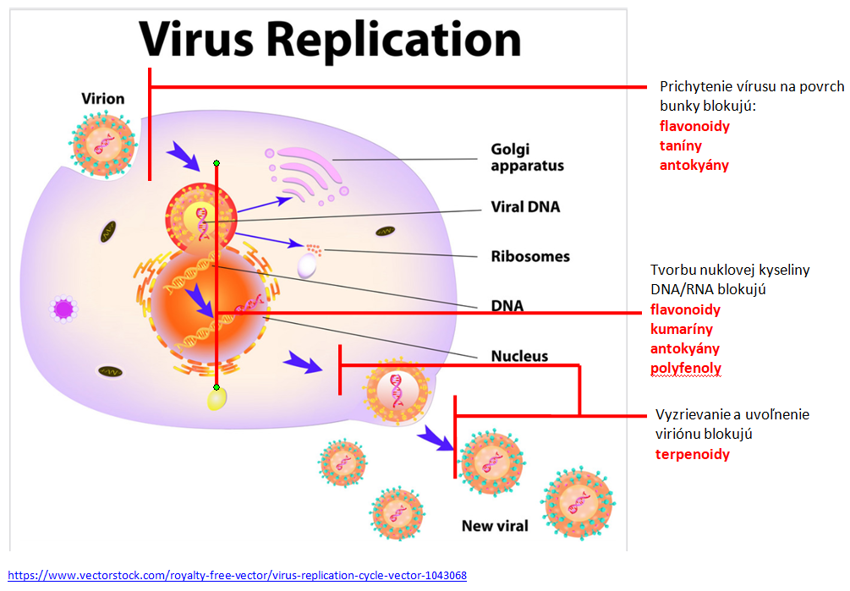 Niektoré molekuly EO potláčajú syntézu - tvorbu vírusových proteínov alebo ich uvoľňovanie z bunky.
